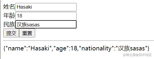 写一个简单的表单,包含姓名,年龄,民族等信息。在下方显示输入表单的值的动态变化