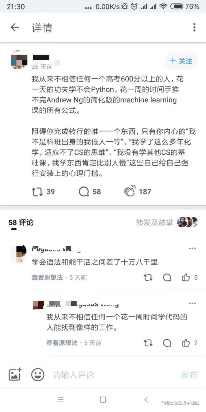 该条动态的作者认为一个高考600分以上的人,一天时间能学会 Python,一周时间就能推完 Andrew Ng 的 ML 课程。