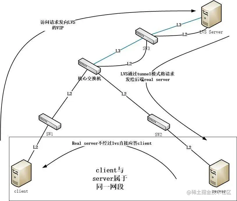 如图,client 请求 server 上的服务,数据包的的发送路径是:client-->SW1-->核心交换机-->SW3-->LVS Server-->SW3-->核心交换机-->SW2→server