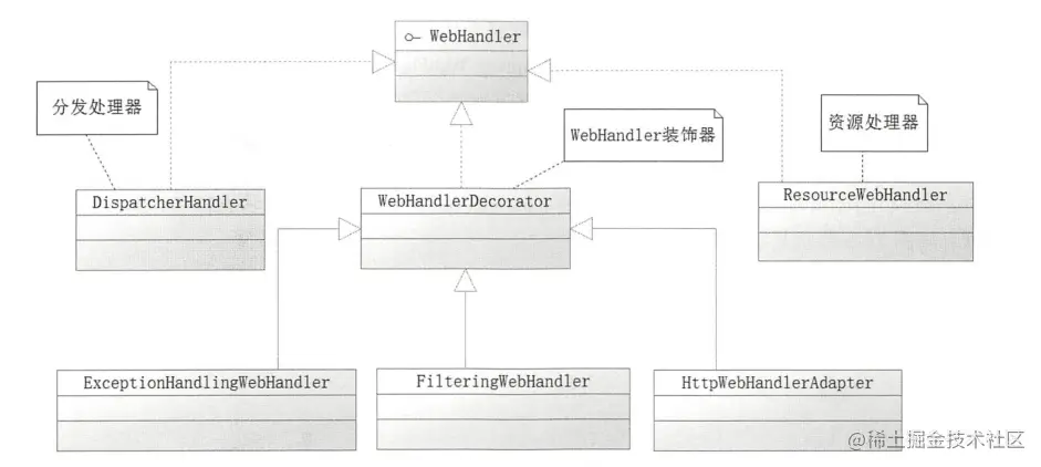 与Spring MVC使用DispactcherServlet不同的是Spring WebFlux使用的是WebHandler。它与DispatcherServlet 有异曲同工之妙,它们十分相似。WebHandler是一个接口,为此Spring WebFlux为其提供了几个实现类,以便于在不同的场景下使用。