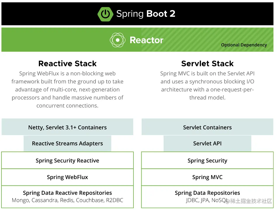 在Servlet3.1规范发布后,JavaEE就已经能够支持响应式的编程。Spring5发布了新一代响应式的Web框架,那便是Spring WebFlux。