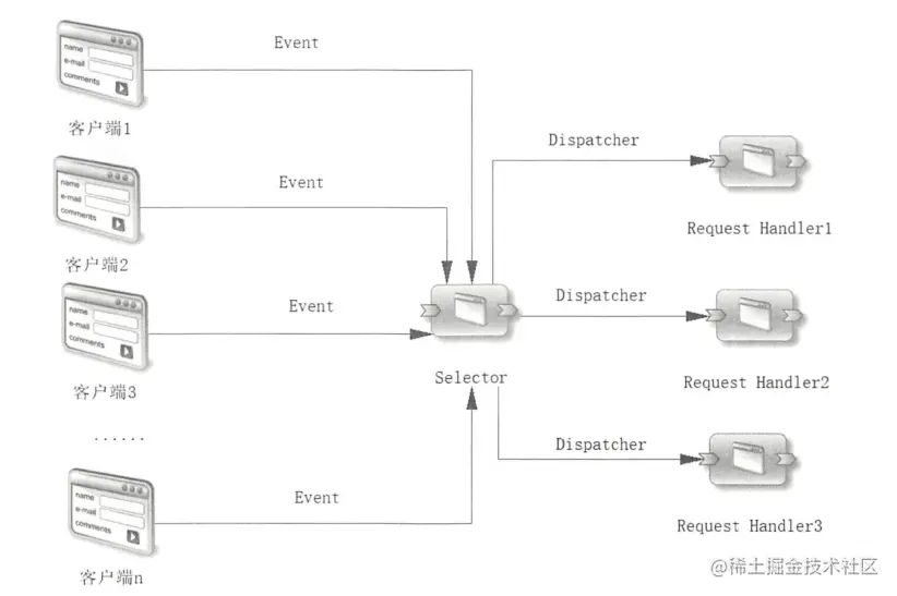 首先客户端会先向服务器注册其感兴趣的事件(Event),这样客户端就订阅了对应的事件,只是订阅事件并不会给服务器发送请求。当客户端发生一些已经注册的事件时,就会触发服务器的响应。当触发服务器响应时,服务器存在一个Selector线程,这个线程只是负责轮询客户端发送过来的事件,并不处理请求,当它接收到有客户端事件时,就会找到对应的请求处理器(Request Handler),然后启用另外一条线程运行处理器。因为Selector线程只是进行轮询,并不处理复杂的业务功能,所以它可以在轮询之后对请求做实时响应,速度十分快。由于事件存在很多种,所以请求处理器也存在多个,因此还需要进行区分事件的类型,所以Selector存在一个路由的问题。当请求处理器处理业务时,结果最终也会转换为数据流(data stream)发送到客户端。Reactor是一种基于事件的模型,对于服务器线程而言,它也是一种异步的,首先是Selector线程轮询到事件,然后通过路由找到处理器去运行对应的逻辑,处理器最后所返回的结果会转换为数据流。