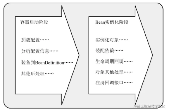 Spring的IoC容器实现以上功能的过程,基本上可以按照类似的流程划分为两个阶段,即容器启动阶段和Bean实例化阶段
