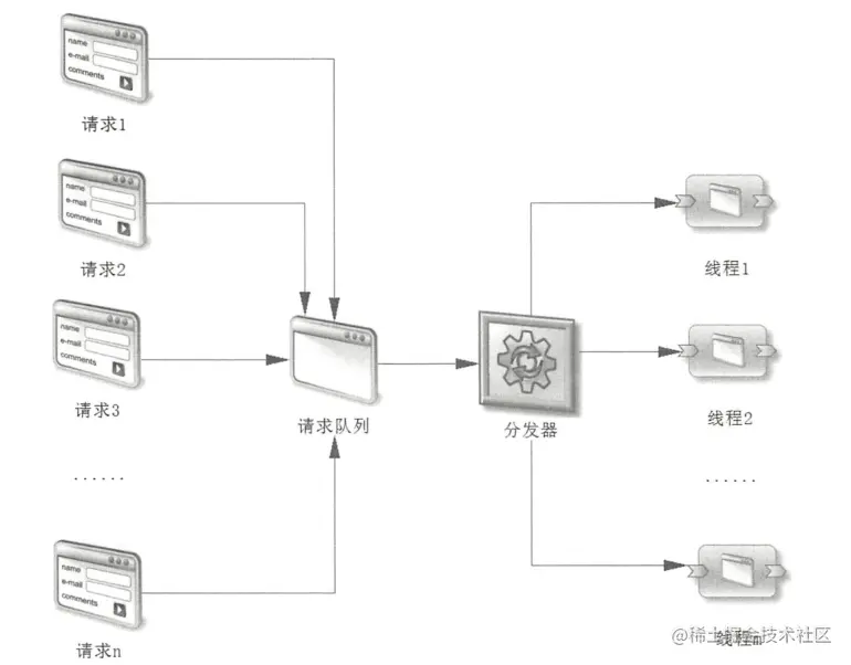 在这个模型中往往是请求量大于系统最大线程数(这里记为M),假设大部分请求是比较耗时的操作,那么请求数量上来后,M条线程就不能及时地响应用户了。很显然,大量的线程就只能在请求队列中等待或者被系统所抛弃,这样对于后续的请求而言,要么新来的线程要等到旧线程运行完成后才能提供服务,要么就被系统所抛弃。这样的场景往往存在那种需要大量数据流的网站中,如视频、游戏、图片和复杂计算等的网站就常常发生这样的场景。