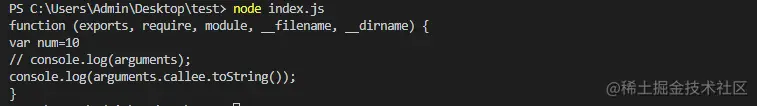function(exports,require,module,__filename,__dirname){var num=10}var num = 10; console.log(arguments);//打印当前模块的组成信息 console.log(arguments.callee.toString()); //打印的函数体 -