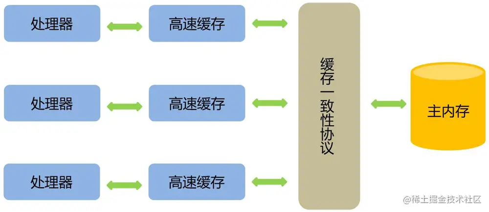 在多处理器下,为了保证各个处理器的缓存是一致的,就会实现缓存一致性协议,当某个CPU在写数据时,如果发现操作的变量是共享变量,则会通知其他CPU告知该变量的缓存行是无效的,因此其他CPU在读取该变量时,发现其无效会重新从主存中加载数据。