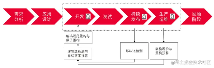 - 在**生产运维环节,**需要做定期的架构看护,将相应度量结果通过架构可视化图形界面展示出来,当架构某个模块腐化到一个阈值时自动报警,提示版本负责人做相应重构。