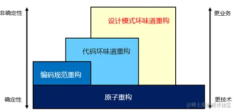 设计模式坏味道重构:这层重构应该属于金字塔顶端的重构,因为它涉及范围太广,更偏向于对业务的理解与预测,从具象到抽象,显得有些虚无缥缈。设计模式有7中坏味道和11中原则,目前无论学术界还是工业界对于这类问题检测、重构相关的研究都还不多。