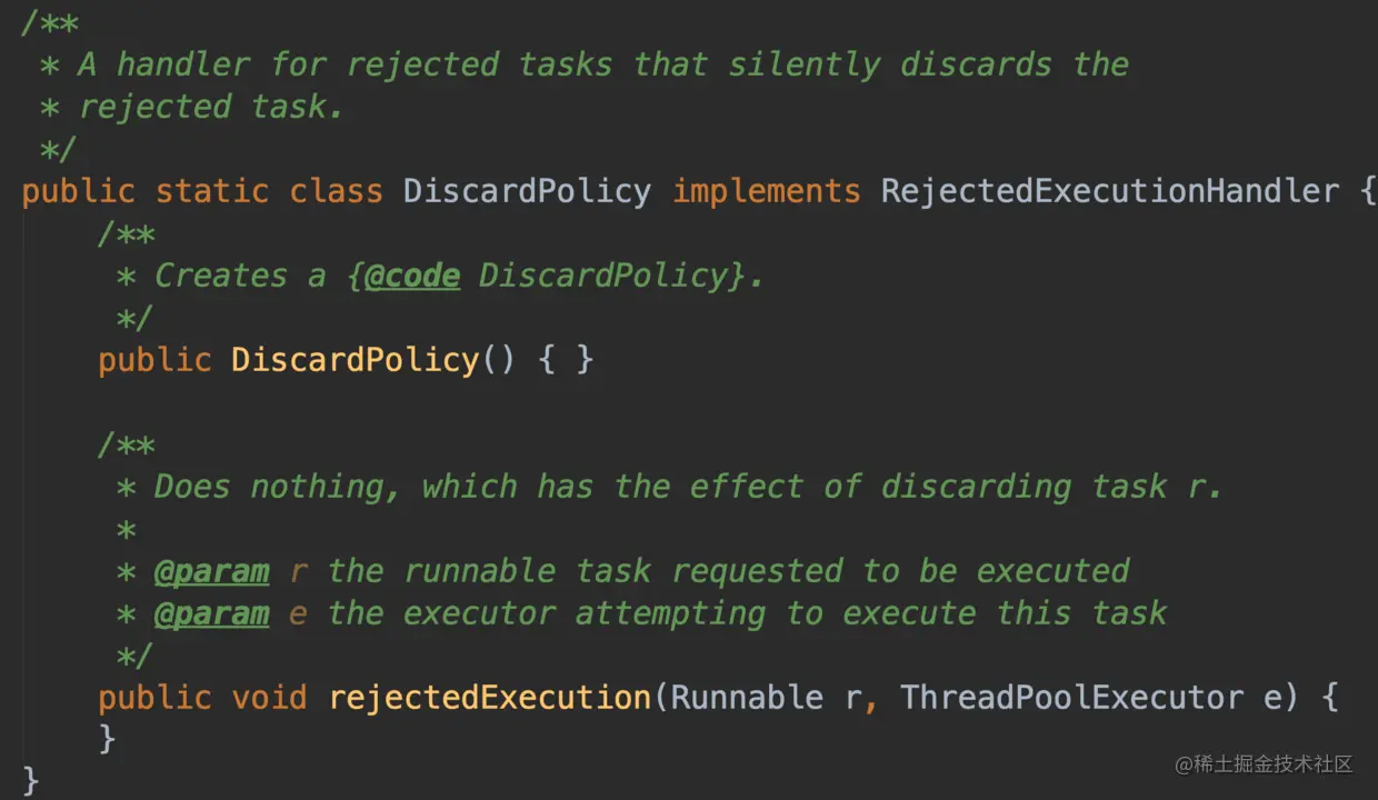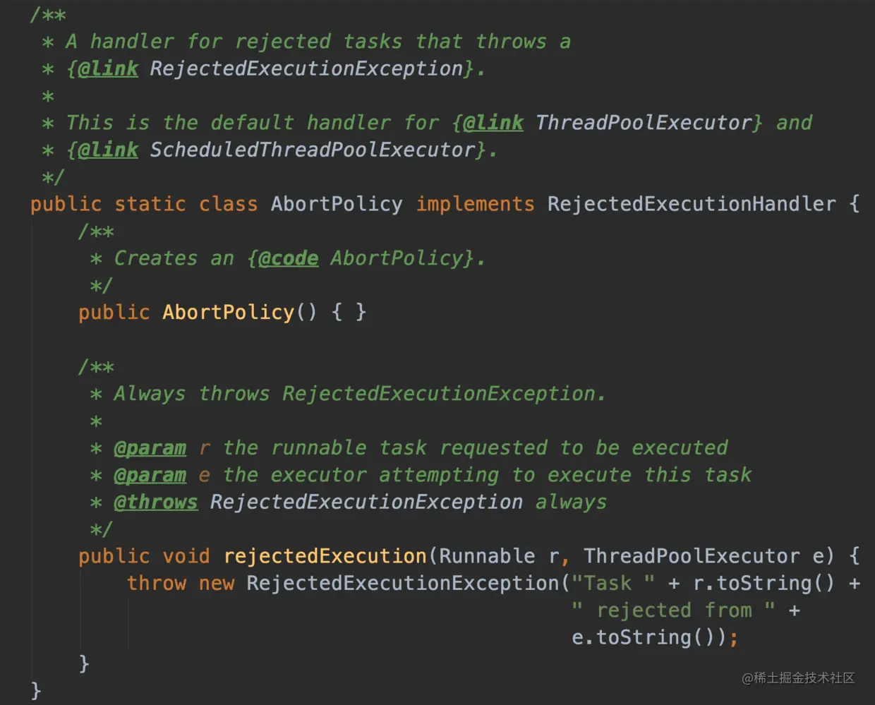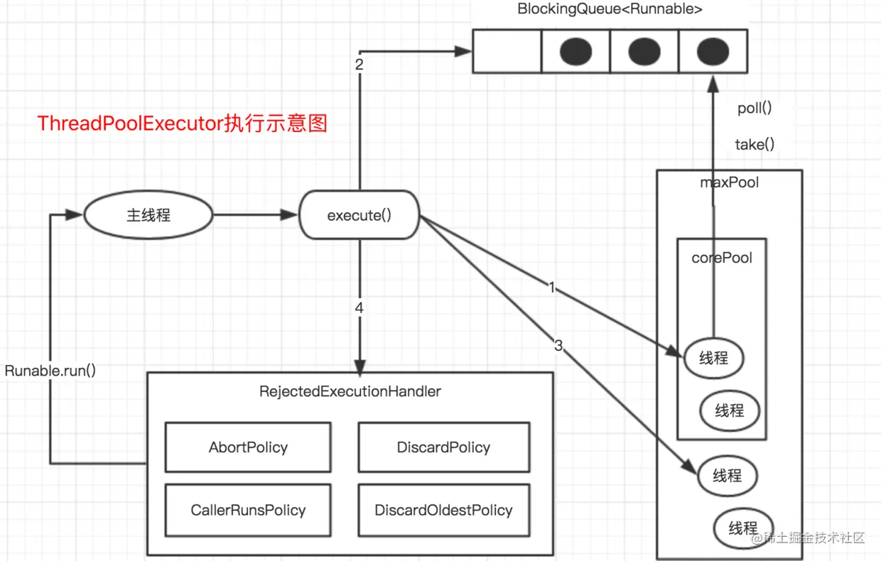 - rejectedExecutionHandler 用于处理当线程池不能执行此任务时的情况,默认有抛出 RejectedExecutionException 异常、忽略任务、使用提交任务的线程来执行此任务和将队列中等待最久的任务删除,然后提交此任务这四种策略,默认为抛出异常。