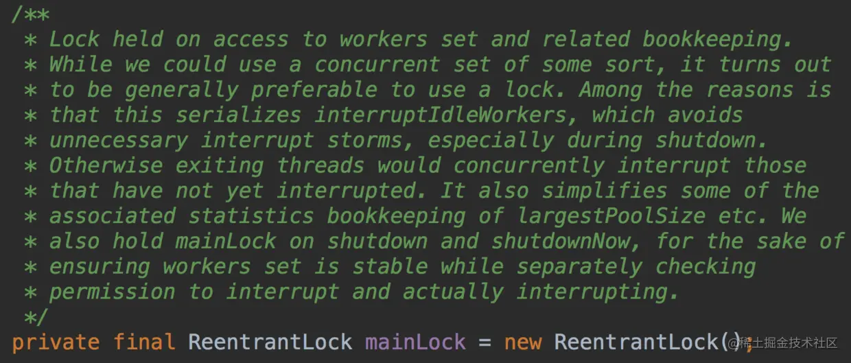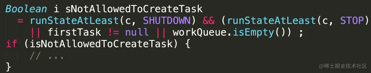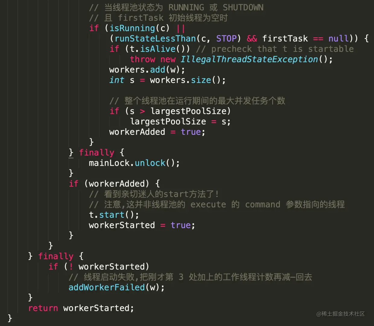 - workers 的数量达到了 corePoolSize,任务入队成功,以此同时线程池被关闭了,而且关闭线程池并没有将这个任务出队,那么执行拒绝策略。这里说的是非常边界的问题,入队和关闭线程池并发执行,读者仔细看看 execute 方法是怎么进到第一个 reject(command) 里面的。