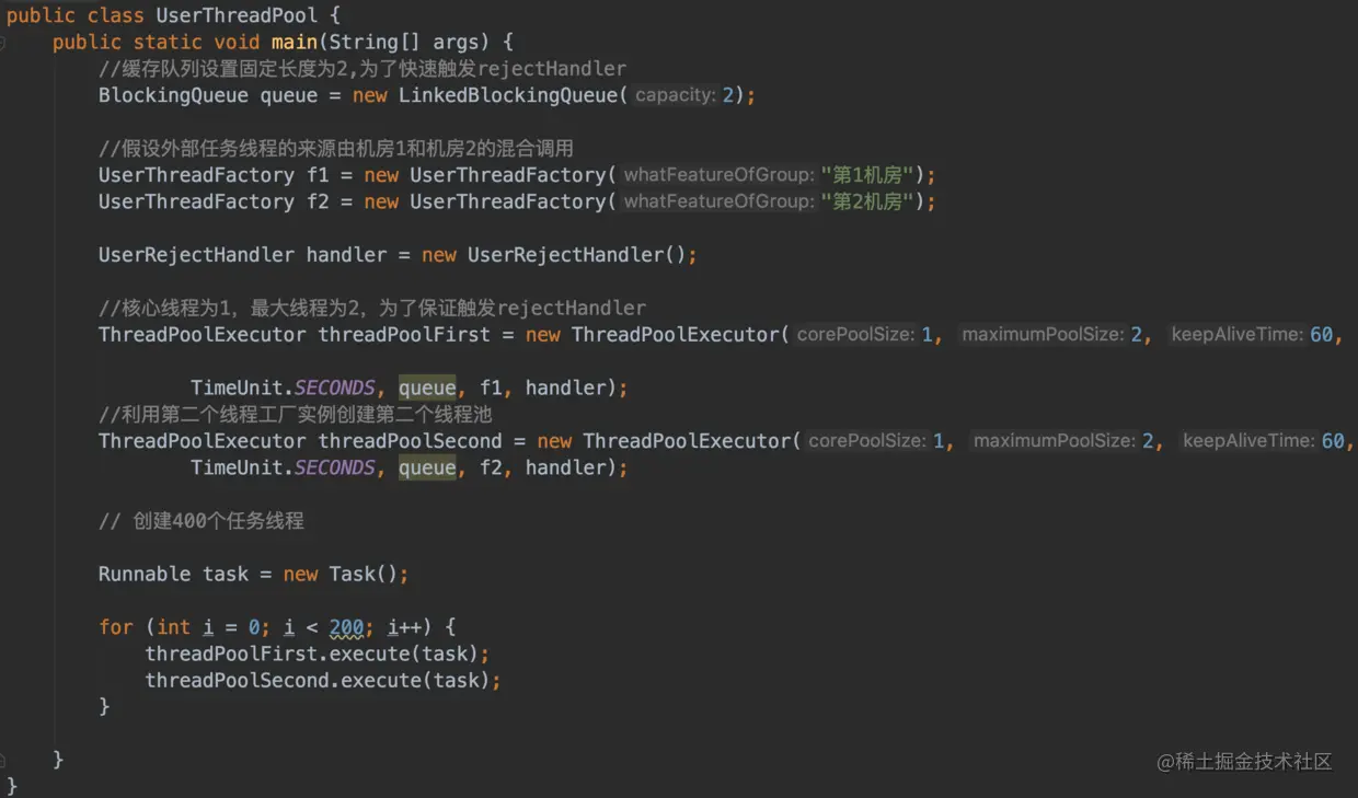 上述示例包括线程工厂和任务执行体的定义; 通过newThread方法快速、统一地创建线程任务,强调线程一定要有特定意义的名称,方便出错时回溯.
