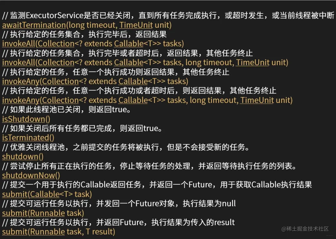 ExecutorService 的抽象类AbstractExecutorService 提供了submit、invokeAll 等方法的实现,但是核心方法Executor.execute()并没有在这里实现。