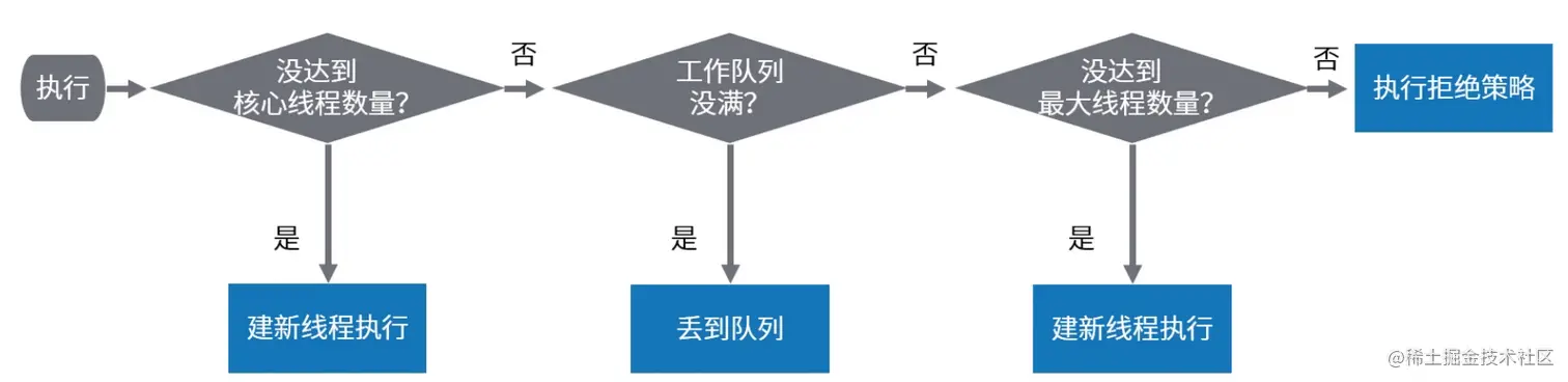- 如果队列已满,那么创建新的线程来执行任务,需要保证池中的线程数不会超过 maximumPoolSize,如果此时线程数超过了 maximumPoolSize,那么执行拒绝策略。