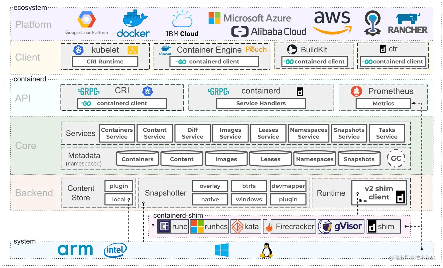 当然,为了让 Docker 以为自己不会抢饭碗,Containerd 声称自己的设计目的主要是为了嵌入到一个更大的系统中(暗指 Kubernetes),而不是直接由开发人员或终端用户使用。