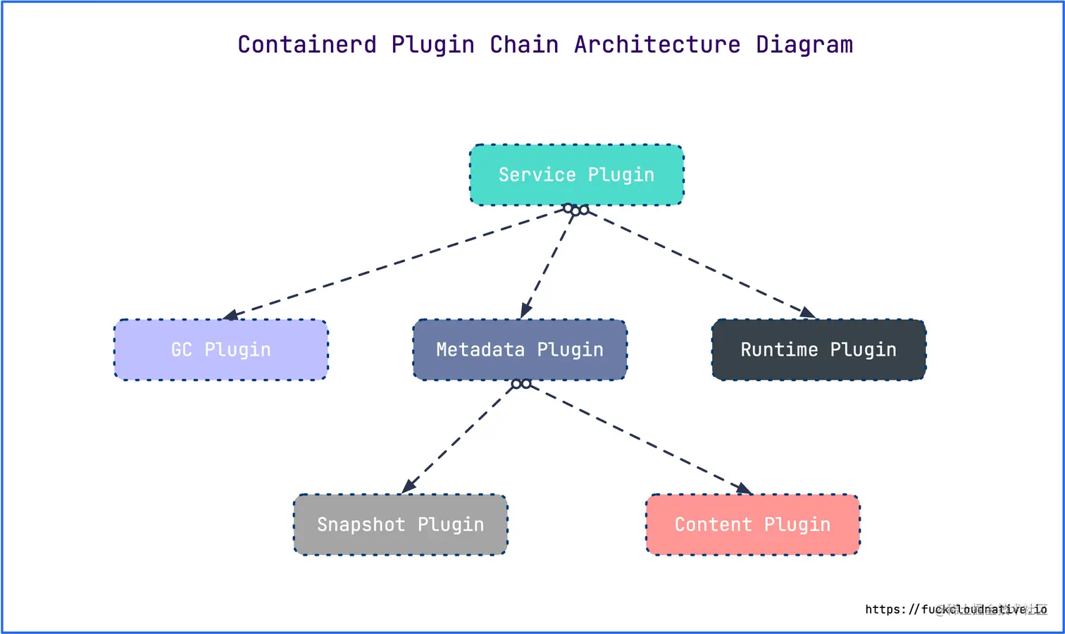 其中,每一个子系统的行为都由一个或多个模块协作完成(架构图中的 Core 部分)。每一种类型的模块都以插件的形式集成到 Containerd 中,而且插件之间是相互依赖的。例如,上图中的每一个长虚线的方框都表示一种类型的插件,包括 Service Plugin、Metadata Plugin、GC Plugin、Runtime Plugin 等,其中 Service Plugin 又会依赖 Metadata Plugin、GC Plugin 和 Runtime Plugin。每一个小方框都表示一个细分的插件,例如 Metadata Plugin 依赖 Containers Plugin、Content Plugin 等。 总之,万物皆插件,插件就是模块,模块就是插件。
