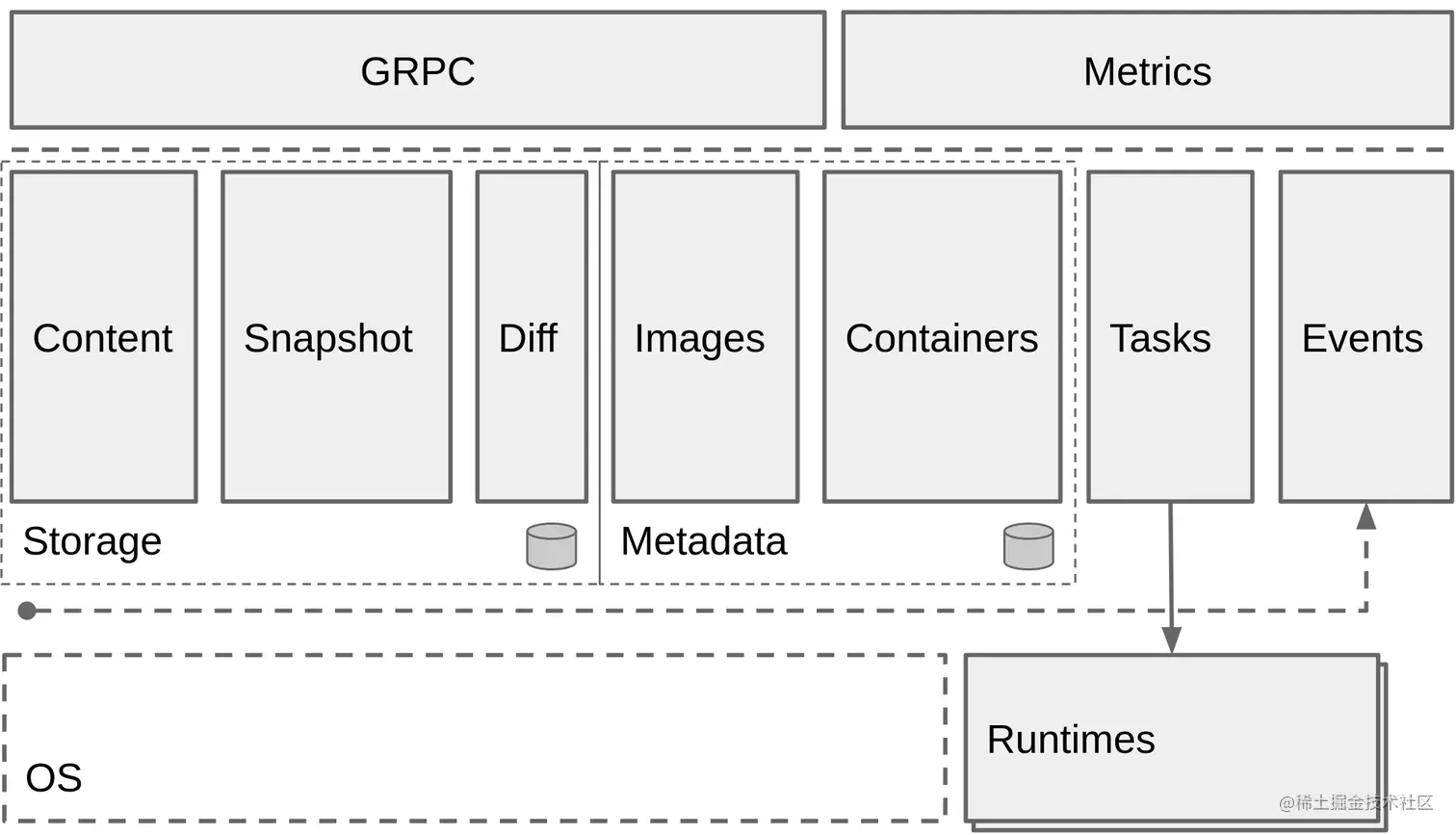 从总体来看,Containerd 被分为三个大块:Storage、Metadata 和 Runtime,可以将上面的架构图提炼一下:
