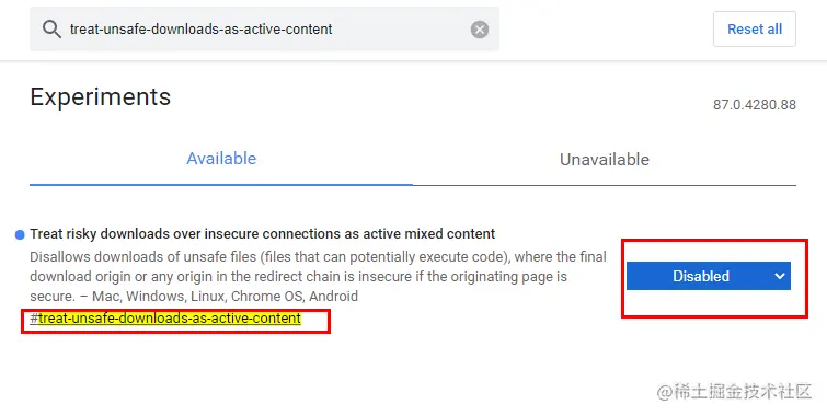 - 找到#treat-unsafe-downloads-as-active-content选项,然后选择Disable之后重启浏览器后,再次下载http文件就可以了