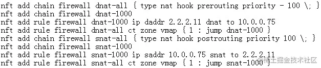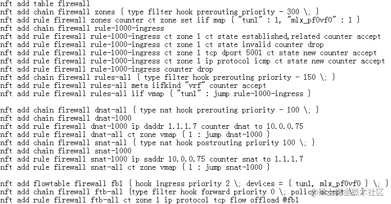 接着,创建firewall规则,允许访问虚拟机的icmp和tcp 5001端口,并且把VF representor port和tun 1隧道设备加入到flowtable做offload。 最后,创建NAT转发规则:dst ip address 2.2.2.11 dnat to 10.0.0.75、src ip address 10.0.0.75 snat to 2.2.2.11。
