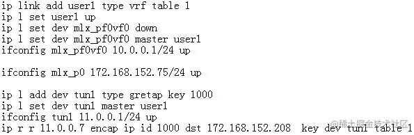 创建一台虚拟机,配置虚拟机地址为10.0.0.75,具有外部地址2.2.2.11。host创建user1的vrf,创建key 1000的gretap tunnel device tun1。将虚拟机对应的VF representor mlx_pf0vf0和tun1加入到user1 vrf。PF mlx_p0配置underlay地址172.168.152.75/24。PF对端连接物理机网卡配置地址172.168.152.208/24, 创建gretap tunnel tun, tun设备的remote为172.168.152.75,key为1000,设置地址为1.1.1.7。 首先,虚拟机与对端物理机tun设备通过tunnel相互访问: