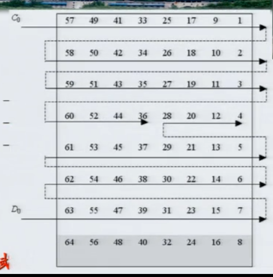 1、置换:先将64位筛选成为56位,作用去密钥中的8个奇偶校验位8的倍数位。按照以下矩阵排列。