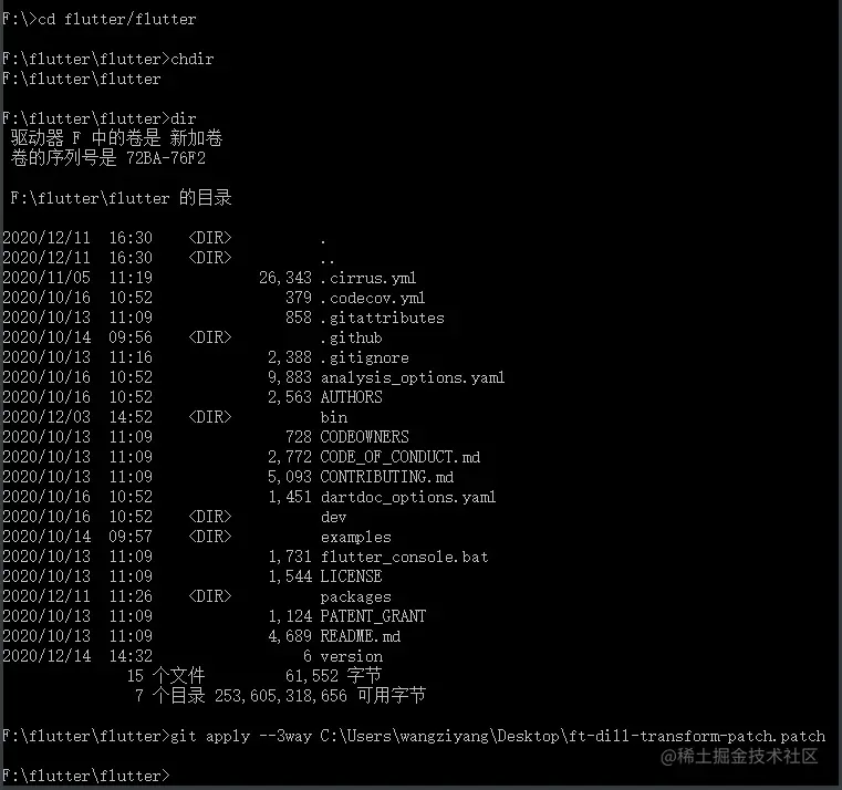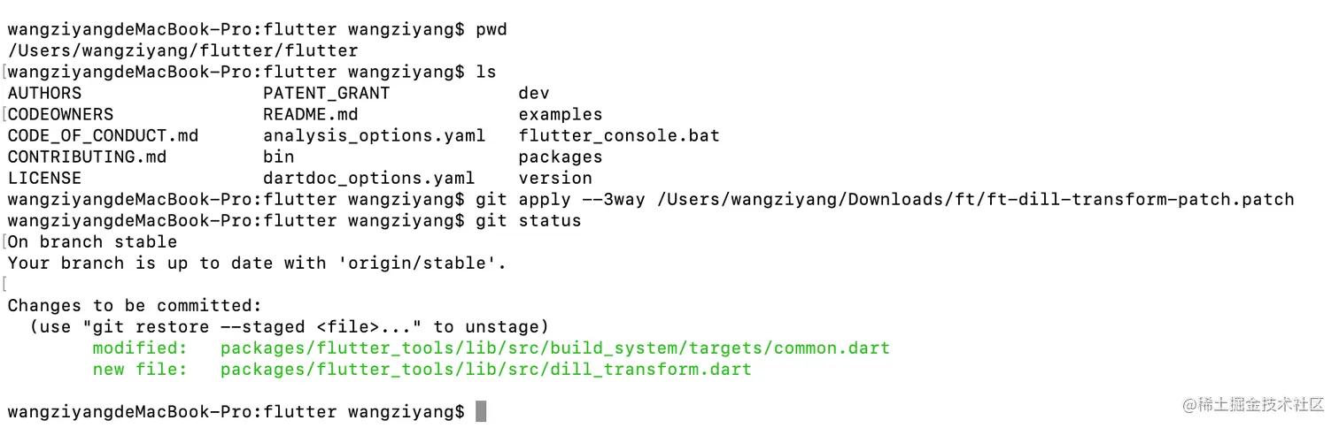 flutter tools进行patch,在Flutter仓库目录下执行:git apply --3way [ft-dill-transform-patch.patch]路径-