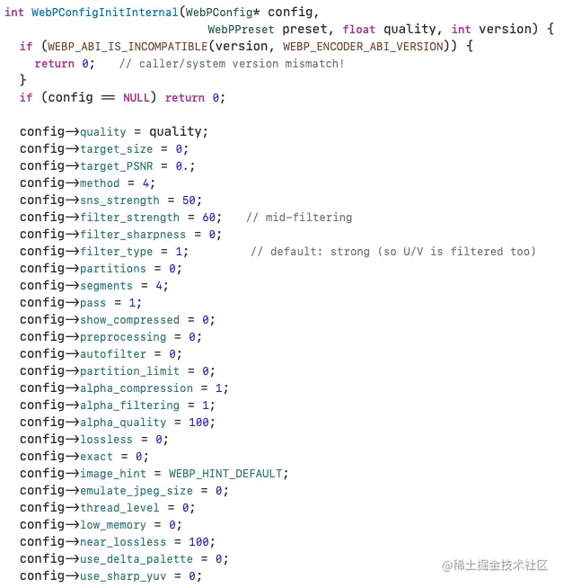 关于WebPConfig的初始化是位于libwebp中的config_enc.c的int WebPConfigInitInternal(WebPConfig* config,