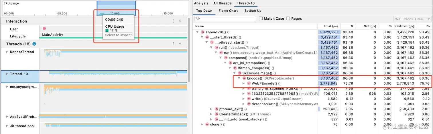 用上述profiler信息可知,在编码过程中app对于手机cpu的占用率只有17%左右,而该过程主要消耗在WebpEncode(),这也是前文提到的webp编码时最终调用的方法。这里的SkEncodeImage也验证了Android的webp编码底层是通过skia封装的。具体源码地址(Android api 28):SkWebpEncoder