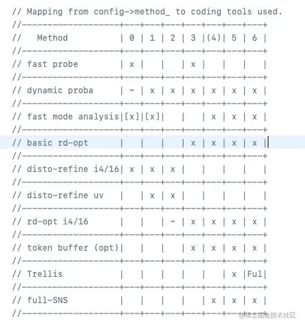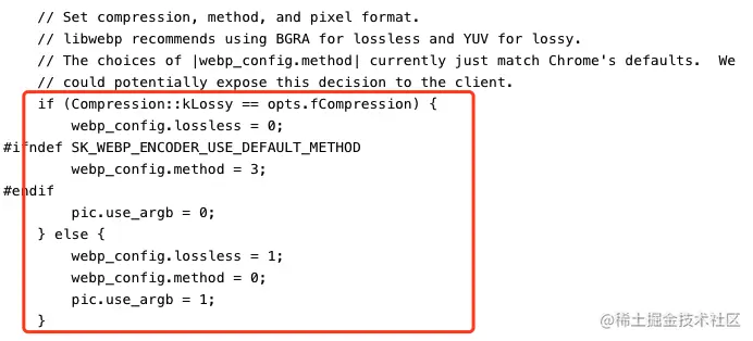 结合配置的初始化可知,lossless即是否为无损编码,默认是0即有损。而Android的api在默认情况下都是有损的。故只需要看if里面的代码块即可。 对于method这个参数,默认是4,我的理解是,编码效果和效率的权衡值,它代表的是编码过程中是否需要经过某些方法处理,来保证编码效果。以下是libwebp对于method的解释,标明了参数是多少时会经历什么处理,项目源码。由于本人对于相关的图像编码处理只停留在应用层级别,所以无法很好地分析具体其中的差异性。如果有这方面知识的朋友可以留言一下。
