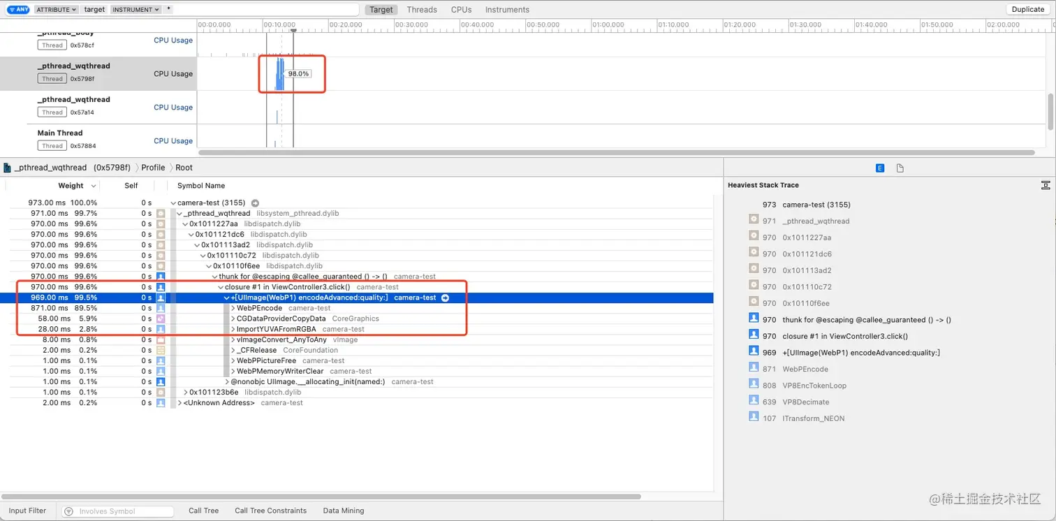 代码中使用的是前文提到的,通过参考SDWebImage的webp编码代码封装的,同样是quality为90的编码,基本于Android底层的webp编码配置相同。Instruments监控显示,在执行编码的时候cpu能飙升到90以上,而主要消耗也是在WebpEncode()上。