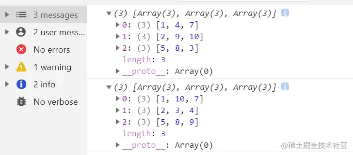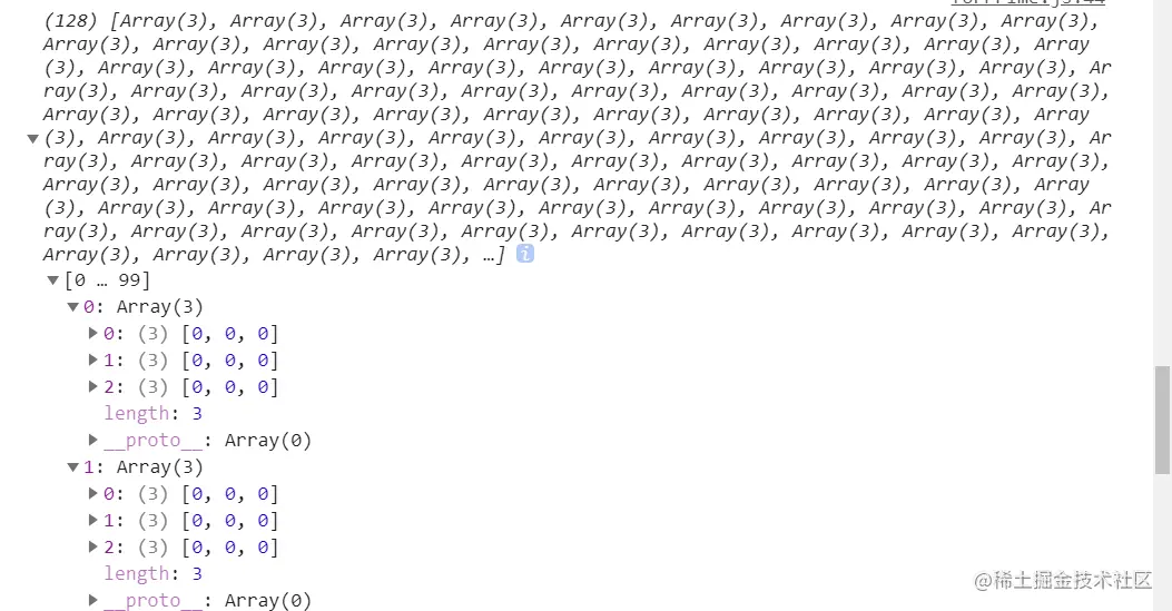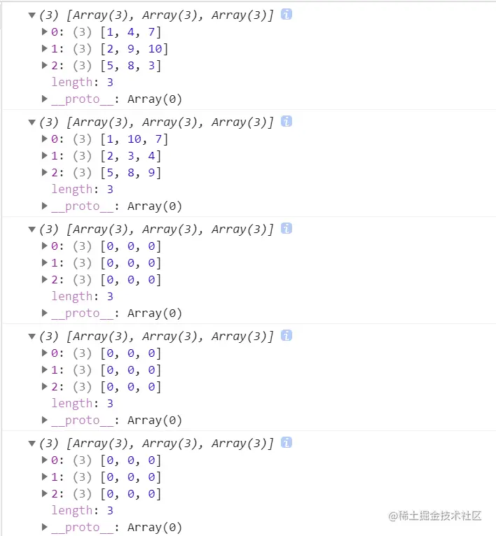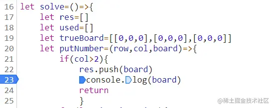 如图res使用来储存所有结果的数组,board是当前棋盘的状态,col>2是递归结束的条件,依次把所有结果push入res,在push后我加入了一个console并下了断点想看看每次push前board是否像输出的结果那样全是0。