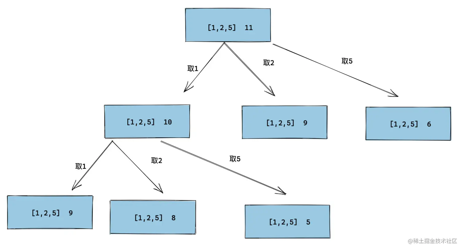 - 如果我们先选了 2,那么再凑出 9 就行了。那怎么凑出 9 呢?不就是 f([1, 2, 5], 9) 么?
