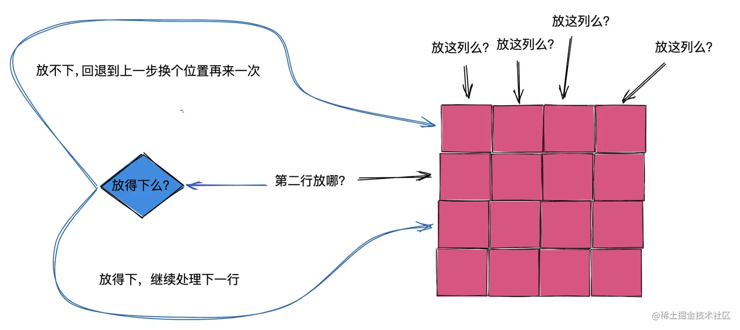 不懂题目意思的可以去看下力扣原题 51. N 皇后。这道题就是典型的回溯题目,什么是回溯?一言以蔽之,那就是一个一个试,不行了就返回上一步继续试。