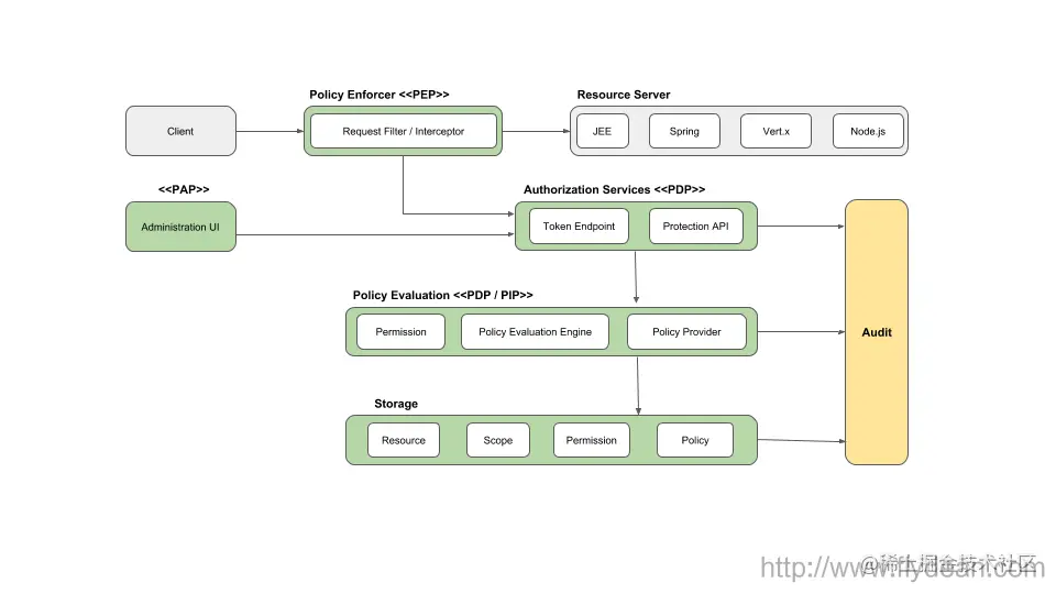 策略的执行就是真正的在资源服务器上执行相应的授权工作。一般来说我们在资源服务器中有一个 Policy Enforcement Point (PEP)来和授权服务器进行交互,根据授权服务器返回的授权信息来执行相应的资源操作。