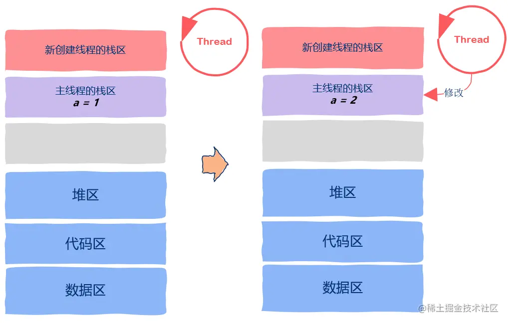 唉,等等!刚不是说栈区是线程私有资源吗,怎么这会儿又说起栈区了?确实,从线程这个抽象的概念上来说,栈区是线程私有的,然而从实际的实现上看,栈区属于线程私有这一规则并没有严格遵守
