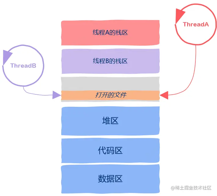 最后,如果程序在运行过程中打开了一些文件,那么进程地址空间中还保存有打开的文件信息,进程打开的文件也可以被所有的线程使用,这也属于线程间的共享资源。