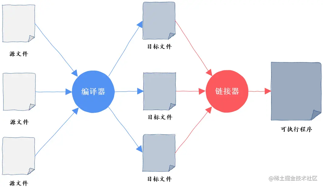 原来,编译器在将可执行程序翻译成机器指令后,接下来还有一个重要的步骤,这就是链接,链接完成后生成的才是可执行程序。完成链接这一过程的就是链接器。