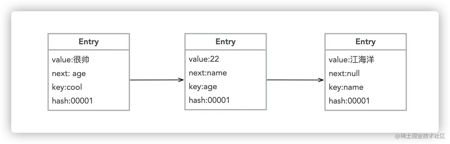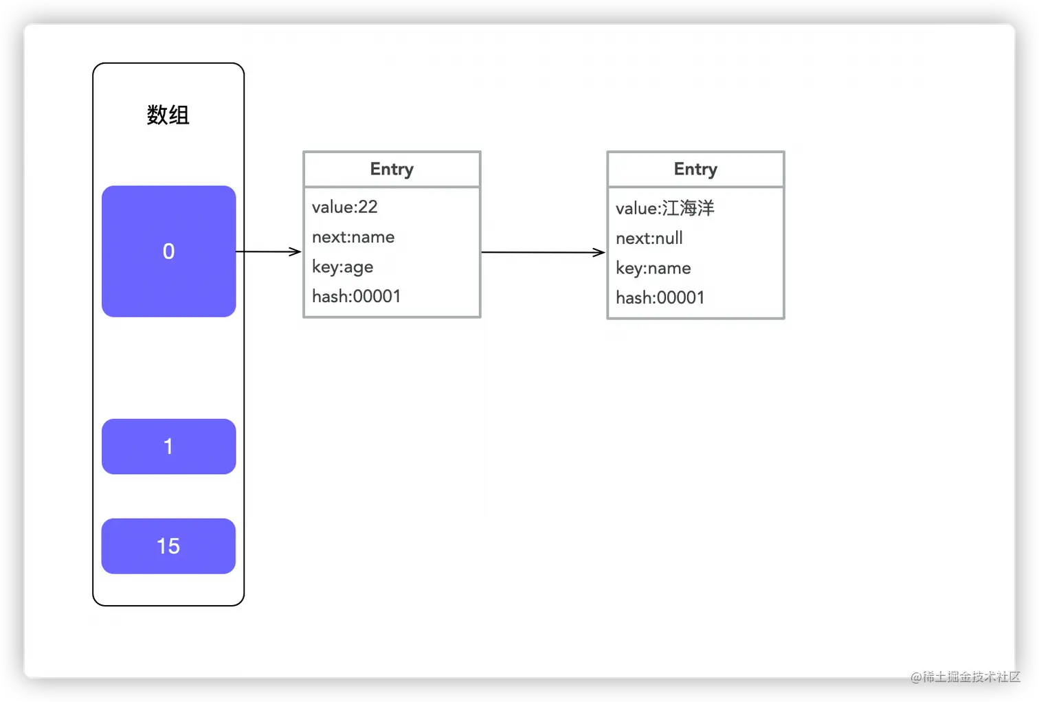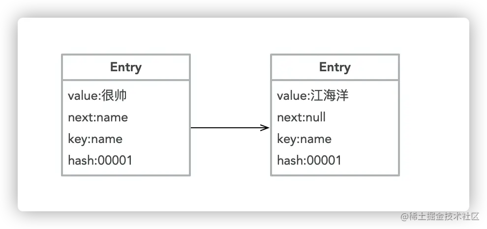 给定一个key,先经过Hash运算,判断其应该放在哪个数组。🌰 例如 map.put("name","江海洋"),经过Hash运算,得到name下标为0,那么将这个value:江海洋填入下边为0的数组