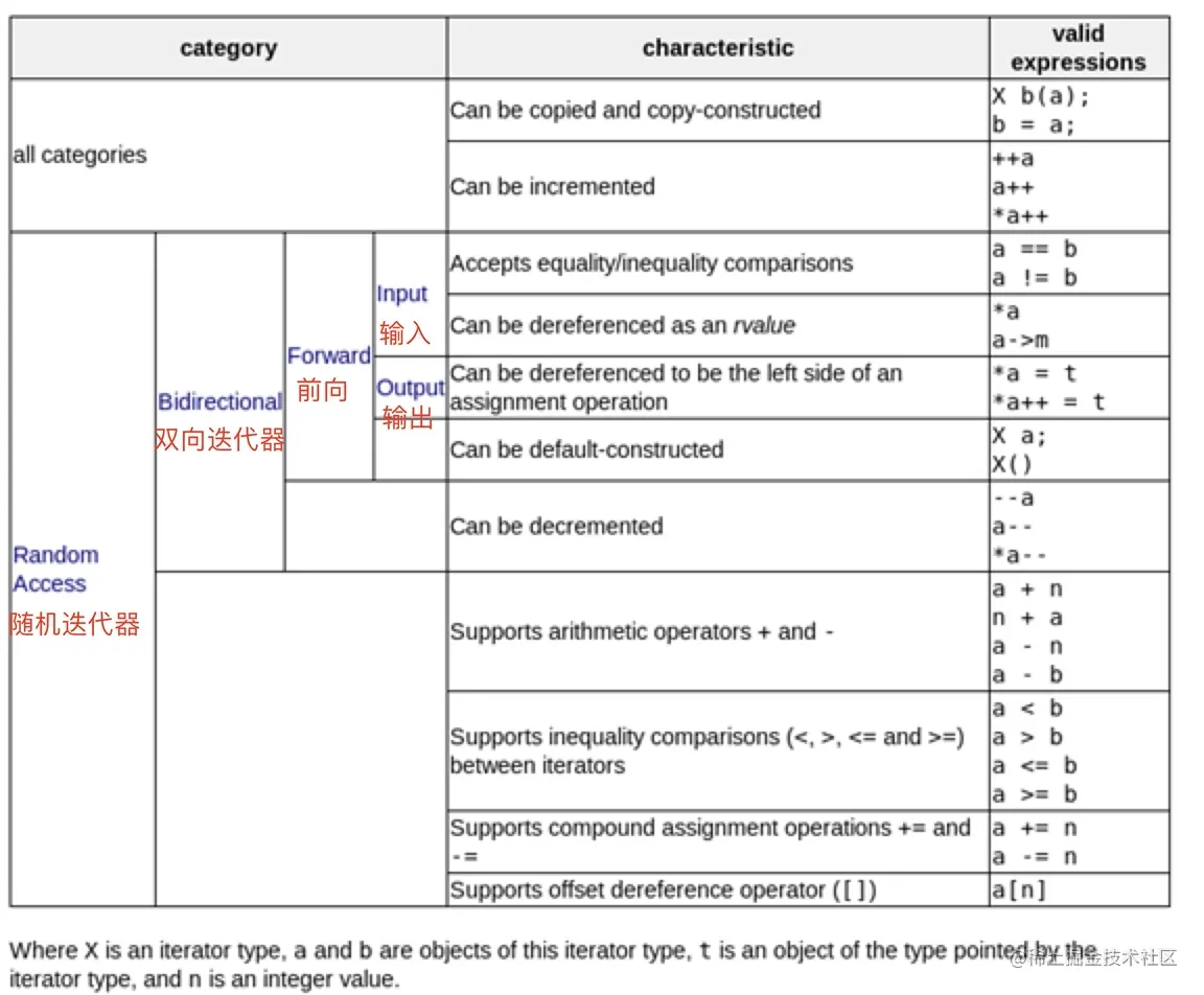 Input Iterator: 此迭代器不允许修改所指的对象,是只读的。支持 ==、!=、++、*、-> 等操作。Output Iterator:允许算法在这种迭代器所形成的区间上进行只写操作。支持 ++、* 等操作。Forward Iterator:允许算法在这种迭代器所形成的区间上进行读写操作,但只能单向移动,每次只能移动一步。支持 Input Iterator 和 Output Iterator 的所有操作。Bidirectional Iterator:允许算法在这种迭代器所形成的区间上进行读写操作,可双向移动,每次只能移动一步。支持 Forward Iterator 的所有操作,并另外支持 – 操作。Random Access Iterator:包含指针的所有操作,可进行随机访问,随意移动指定的步数。支持前面四种 Iterator 的所有操作,并另外支持 [n] 操作符等操作。