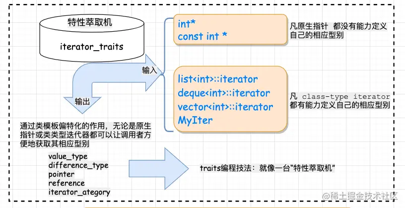 总结:核心知识点在于 模板参数推导机制+内嵌类型定义机制, 为了能处理原生指针这种特殊的迭代器,引入了偏特化机制。traits 就像一台 “特性萃取机”,把迭代器放进去,就能榨取出迭代器的特性。