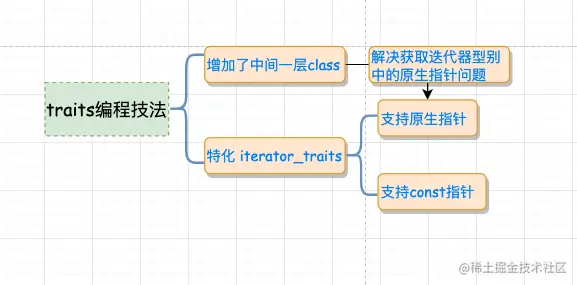 通过上面几节的介绍,我们知道,所谓的 traits 编程技法无非 就是增加一层中间的模板 class,以解决获取迭代器的型别中的原生指针问题。利用一个中间层 iterator_traits 固定了 func 的形式,使得重复的代码大量减少,唯一要做的就是稍稍特化一下 iterator_tartis 使其支持 pointer 和 const pointer 。