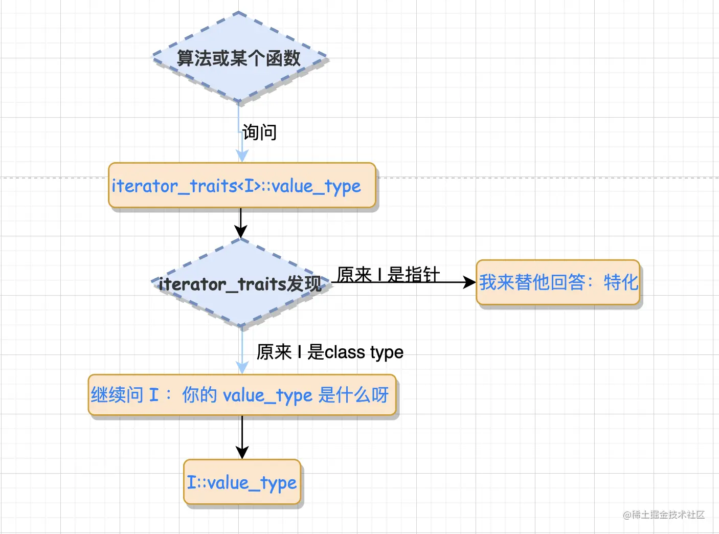 // 首先询问 iterator_traits<I>::value_type,如果传递的 I 为指针,则进入特化版本,iterator_traits 直接回答;如果传递进来的 I 为 class type,就去询问 T::value_type.