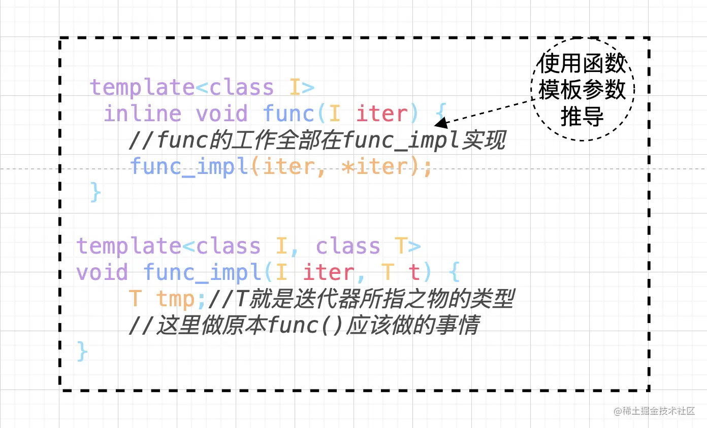 func_imp(iter, *iter); // 传入 iter 和 iter 所指的值,class 自动推导