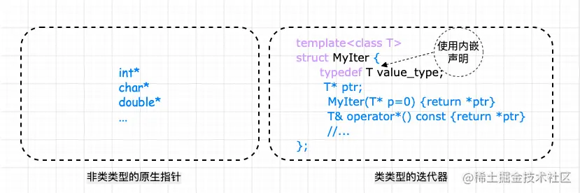 上面的解决方案看着可行,但其实呢,实际上还是有问题,这里有一个隐晦的陷阱:实际上并不是所有的迭代器都是 class type ,原生指针也是一种迭代器,由于原生指针不是 class type ,所以没法为它定义内嵌型别。