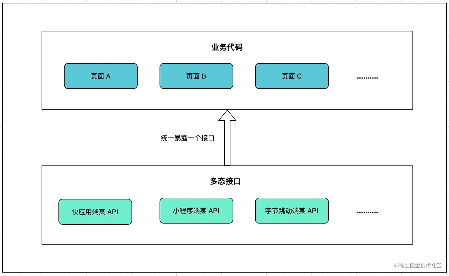 而 Chameleon 框架的核心机制之一 —— 多态协议则是借鉴了这种设计,提供了多态接口和多态组件的方式来扩展第三方端(微信小程序、快应用、字节小程序等)。例如,我们可以通过定义多态接口来实现不同端的特定 API,然后在业务代码层面直接使用定义好的多态接口就可以实现一个方法调用在不同端下的特定 API,这看起来会是这样: