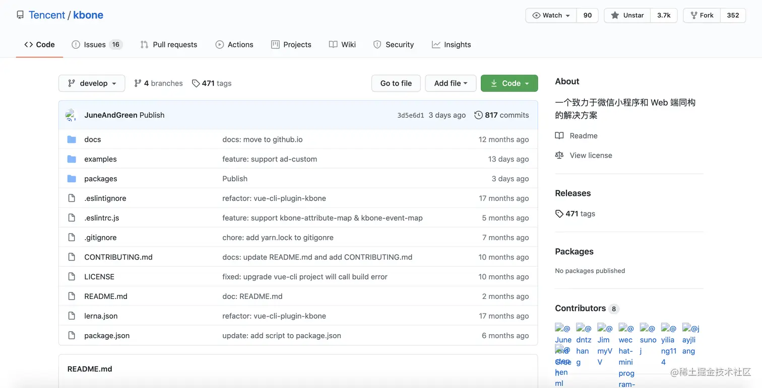 kbone 是腾讯团队推出的一套支持 Web 端和微信小程序端进行同构的跨端框架。但是,显然相比较前面两者,kbone 的使用场景就略少一些,因为其受限于只支持 Web 端和微信小程序端。不过,如果需求只是 H5 和微信小程序,显然 kbone 是一个不错的选择,毕竟原装正版(腾讯)的技术支持。