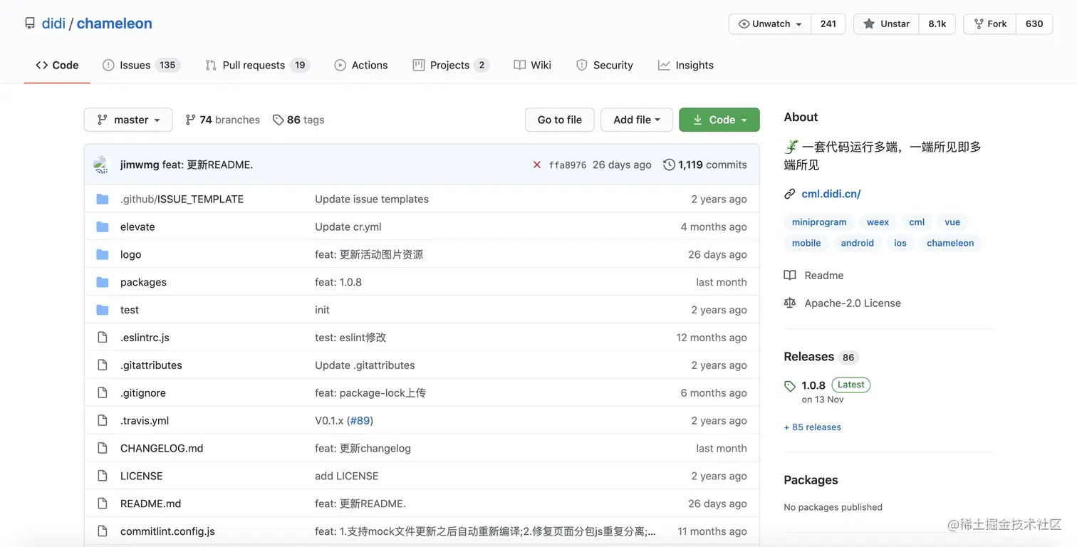 uniapp 我想很多同学都耳熟能详,估计有些接触的前端同学,就是因为这个,毕竟 DCloud 也算是“大名鼎鼎”。前面,也提及 mpvue 最近的一次的 commit 已经是 17 个月前,而 uniapp 可以支持把 mpvue 的项目转为 uniapp 的项目(估计能多不少使用者 😏)。