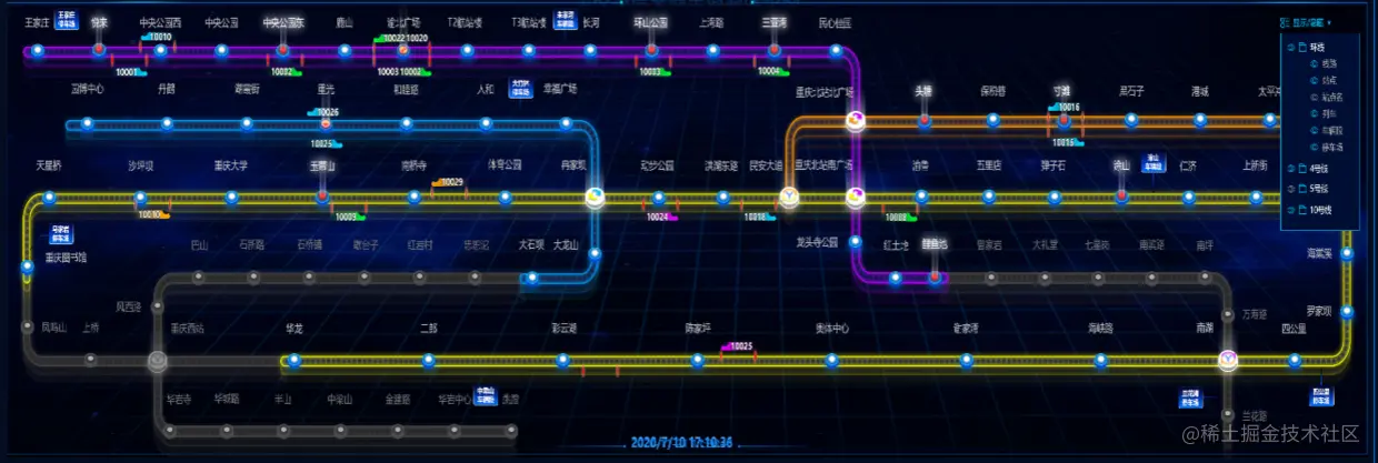 在之前的一个轨道交通可视化项目中,运用到了很多绘制技巧。 可以参考 之前的一篇文章 《利用canvas阴影功能与双线技巧绘制轨道交通大屏项目效果》