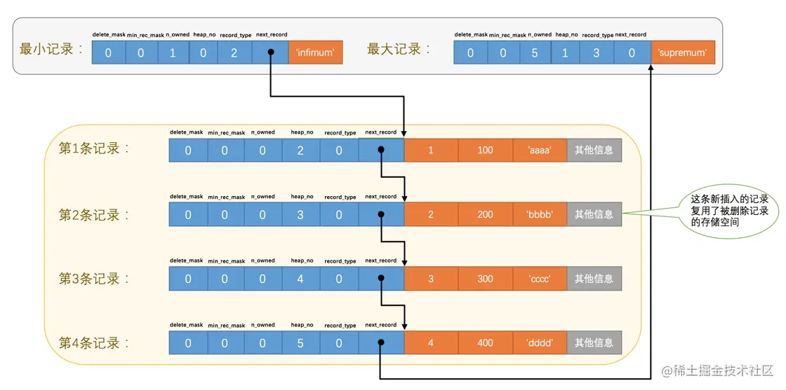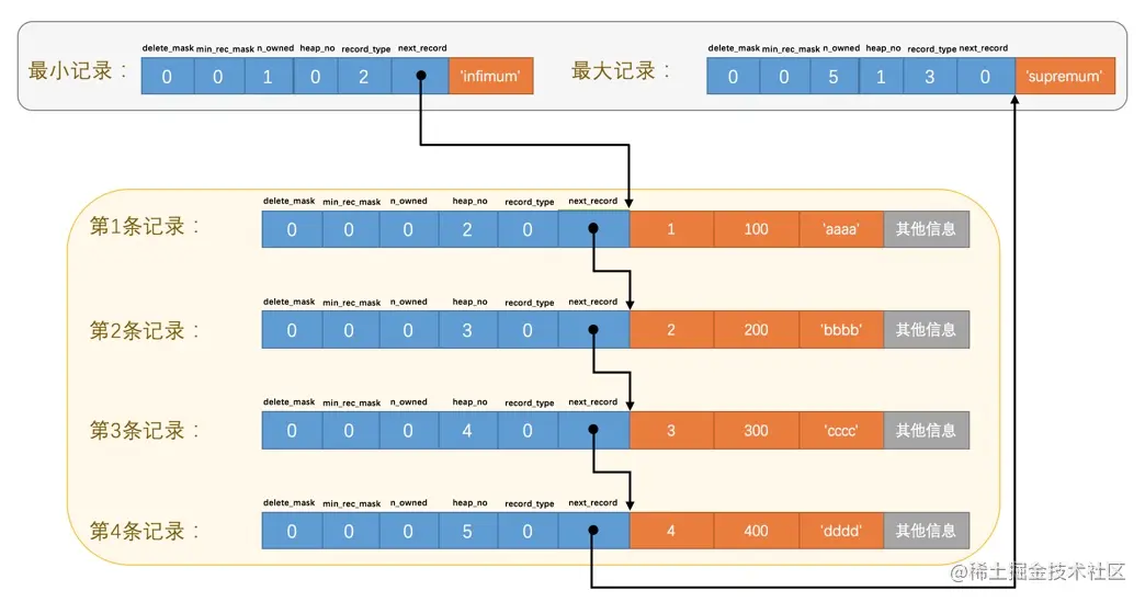 - next_record:它表示从当前记录的真实数据到下一条记录的真实数据的地址偏移量。比方说第一条记录的next_record值为32,意味着从第一条记录的真实数据的地址处向后找32个字节便是下一条记录的真实数据。如果你熟悉数据结构的话,就立即明白了,这其实是个链表,可以通过一条记录找到它的下一条记录。但是需要注意注意再注意的一点是,下一条记录指得并不是按照我们插入顺序的下一条记录,而是按照主键值由小到大的顺序的下一条记录。而且规定 Infimum记录(也就是最小记录) 的下一条记录就是本页中主键值最小的用户记录,而本页中主键值最大的用户记录的下一条记录就是 Supremum记录(也就是最大记录)
