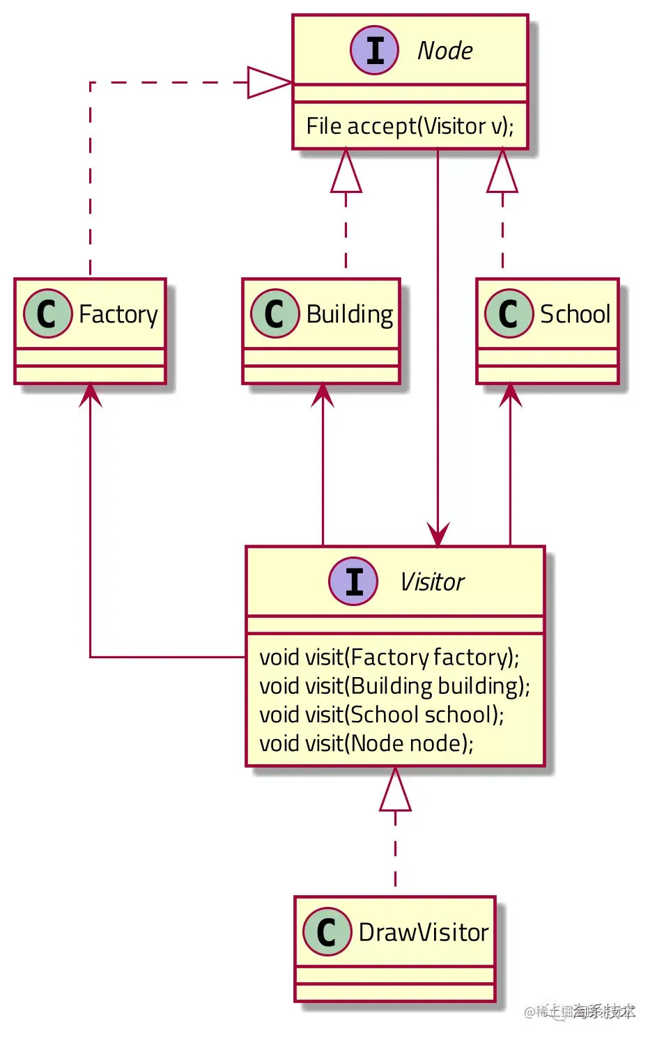 由于所有的实现方法均写在一个类中(如DrawVisitor),我们可以非常方便地让各个类型(如Factory/Building/School)都使用同一个逻辑,而不是把这个逻辑重复写在每个接口实现类中。