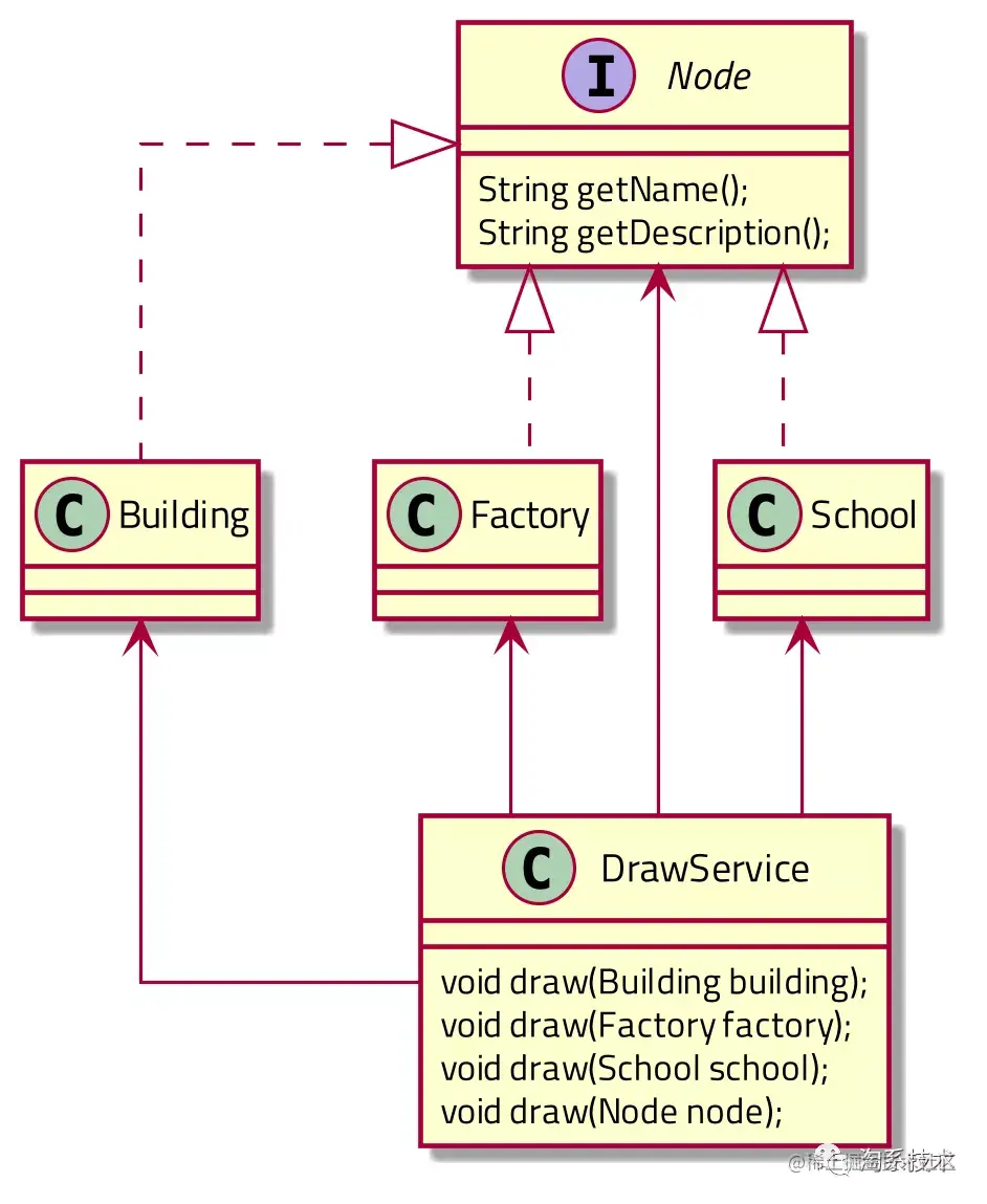 所有实现类(Factory/School/Building)的方法(draw)全部都写在一个类(DrawVisitor)中,这在某种程度上属于逻辑耦合,不利于代码维护。